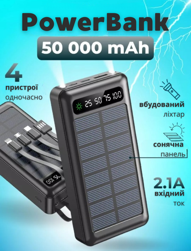 50 000 мА·год — це резерв енергії, на який ви можете покластися. Зарядіть смартфон, планшет